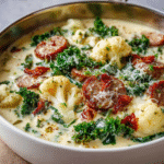 This creamy, hearty, and comforting Keto Zuppa Toscana Soup is the perfect one-pot meal for chilly evenings or cozy family dinners. Made with just four simple ingredients—cauliflower, sausage, kale, and cream—it’s a low-carb twist on a Tuscan classic. The cauliflower adds body, the sausage brings rich flavor, and the kale balances everything with freshness. Quick to make and satisfying, this soup is ideal for keto, gluten-free, or low-carb lifestyles.