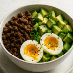 This High Protein Low Carb Power Bowl is hearty, satisfying, and nutrient-packed—perfect for busy weeknights or post-workout fuel. With creamy avocado, tender soft-boiled eggs, and savory seasoned ground beef, it delivers a balance of textures and flavors. Ready in just 15 minutes, this power bowl is ideal for meal prep, low-carb diets, or a quick energy boost. Whether you’re enjoying it for lunch or dinner, this recipe keeps you full, energized, and guilt-free.