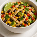 In a large mixing bowl, combine shredded chicken, beans, corn, bell pepper, avocado, green onions, and cilantro.