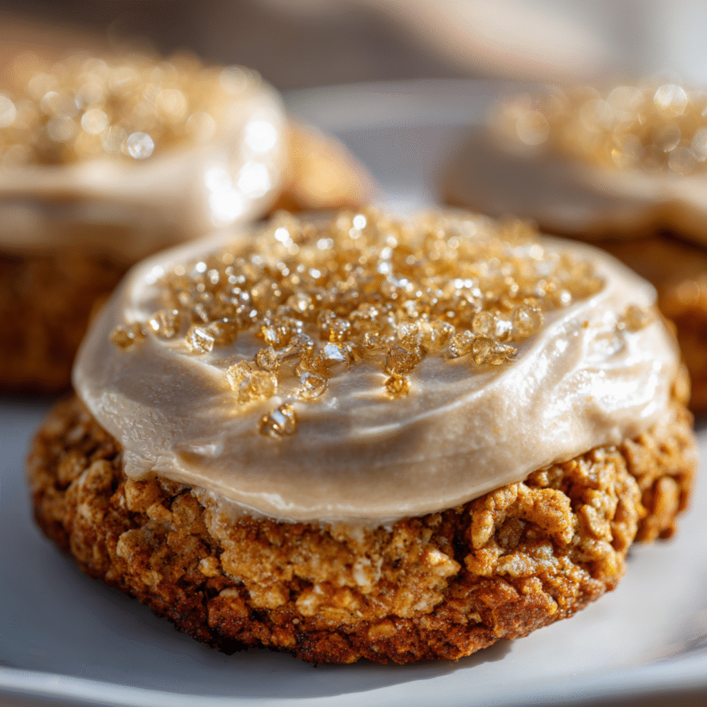 Pumpkin desserts trace their roots back to early American settlers who used pumpkins in pies, puddings, and breads. Oats, introduced later, became a pantry staple in the 19th century, beloved for their hearty texture. Combining the two creates a warm, comforting cookie that feels like autumn in every bite. The maple frosting is inspired by traditional New England flavors, adding a silky sweetness that complements the pumpkin spice perfectly.