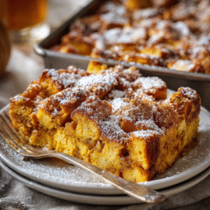 This Pumpkin Spice French Toast Casserole is warm, spiced, and utterly comforting—perfect for autumn mornings, holiday brunches, or even dessert. Made with fluffy bread cubes, creamy pumpkin custard, and a cinnamon-sugar topping, it bakes into a golden casserole that tastes like fall in every bite. Sprinkle with powdered sugar or drizzle with maple syrup, and you’ve got a dish that’s festive, cozy, and completely irresistible.