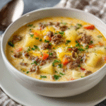 Cheeseburger soup is a relatively modern comfort food, inspired by America’s love of the cheeseburger. While burgers gained fame in the early 20th century, creative home cooks began turning the flavors into soups in the mid-to-late 1900s, combining ground beef, cheddar cheese, and vegetables in a creamy broth. This hearty dish quickly became a Midwest favorite, often appearing in church cookbooks and potluck gatherings. Today, it’s celebrated as a family-friendly meal that combines the best of burgers and comfort soups.
