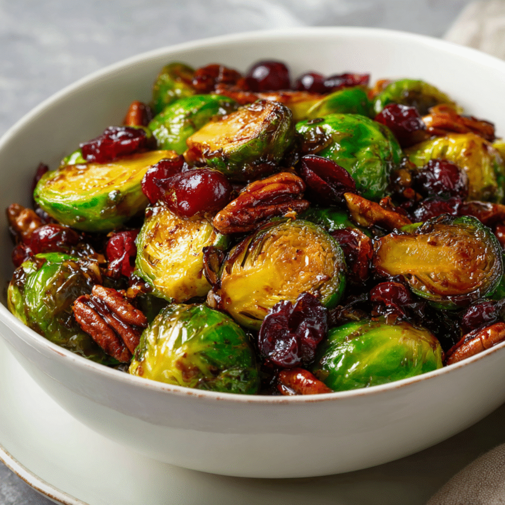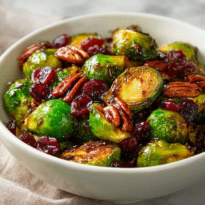 This Roasted Brussels Sprouts with Cranberries & Pecans recipe is crisp, colorful, and festive—the perfect Thanksgiving side dish. The Brussels sprouts are roasted until golden and caramelized, then tossed with tart cranberries and crunchy pecans for a beautiful mix of textures and flavors. A drizzle of maple syrup ties it all together, making this dish a sweet, savory, and nutty holiday favorite. Quick and easy to prepare, it’s a crowd-pleaser that adds both elegance and nutrition to your menu.