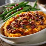 This Thanksgiving Sweet Potato, Cranberry, and Green Bean Medley is festive, creamy, and bursting with seasonal flavors. The sweetness of mashed sweet potatoes, the tart pop of cranberries, and the crisp freshness of green beans make this dish a colorful addition to any holiday spread. Topped with crunchy pecans, it’s a crowd-pleasing side dish that feels both traditional and unique. Perfect for Thanksgiving, Friendsgiving, or any fall celebration, this medley brings comfort and elegance to your table.